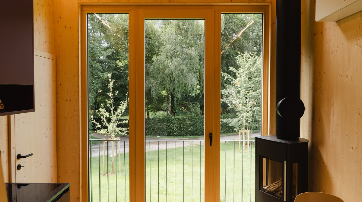 The exterior design of the Tiny Houses combines cosy, warm, traditional wood with cool, dark aluminium. This combination of materials not only creates an attractive contrast, but also blends harmoniously into the surroundings. The wall-high windows on one of the narrow sides are not only a visual eye-catcher, but also flood the room with daylight, creating a bright and inviting feel-good atmosphere.