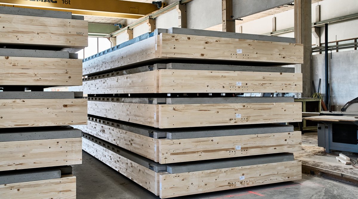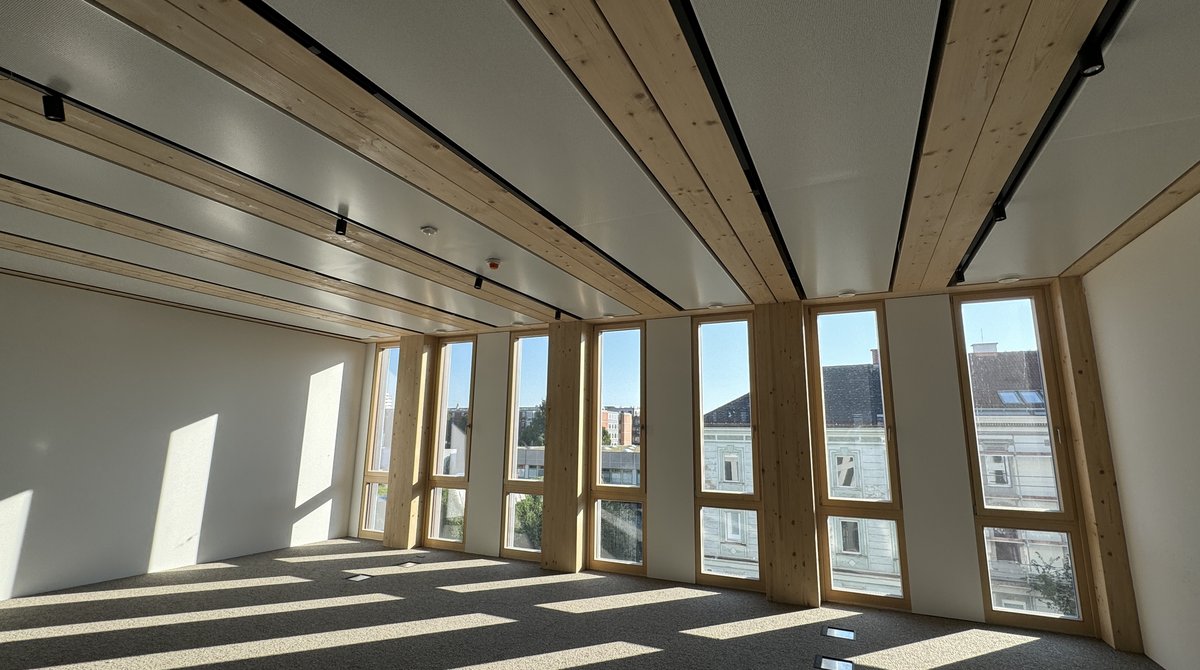 Das Herzstück bilden über 3.950 m² XC®-office Decken mit imposanten Auflagerbalken plus Längsträgern aus BSH-Fichte, produziert von der MMK Holz Beton-Fertigteile GmbH, einem Joint Venture von Mayr-Melnhof Holz und der Kirchdorfer Fertigteilholding. Die bis zu 8,3 m langen Verbundelemente bieten je 23 m² Deckenfläche und kombinieren die Stärken beider Materialien optimal. Der eigens entwickelte Spezialbeton sorgt für optimalen Schall- und Brandschutz, während der Holzanteil einen angenehmen „Wohnzimmercharakter" schafft. Diese Lösung ermöglicht eine effiziente und nachhaltige Bauweise. Die Rippendecke wurde in zwei Ausführungen am Produktionsstandort der Kirchdorfer Gruppe hergestellt. Für die Rippendecke sowie die Stützen, lieferten Mayr-Melnhof Holz Reuthe 72 m³ Brettschichtholz MM masterline und Mayr-Melnhof Holz Gaishorn 520 m² Brettsperrholz MM crosslam.