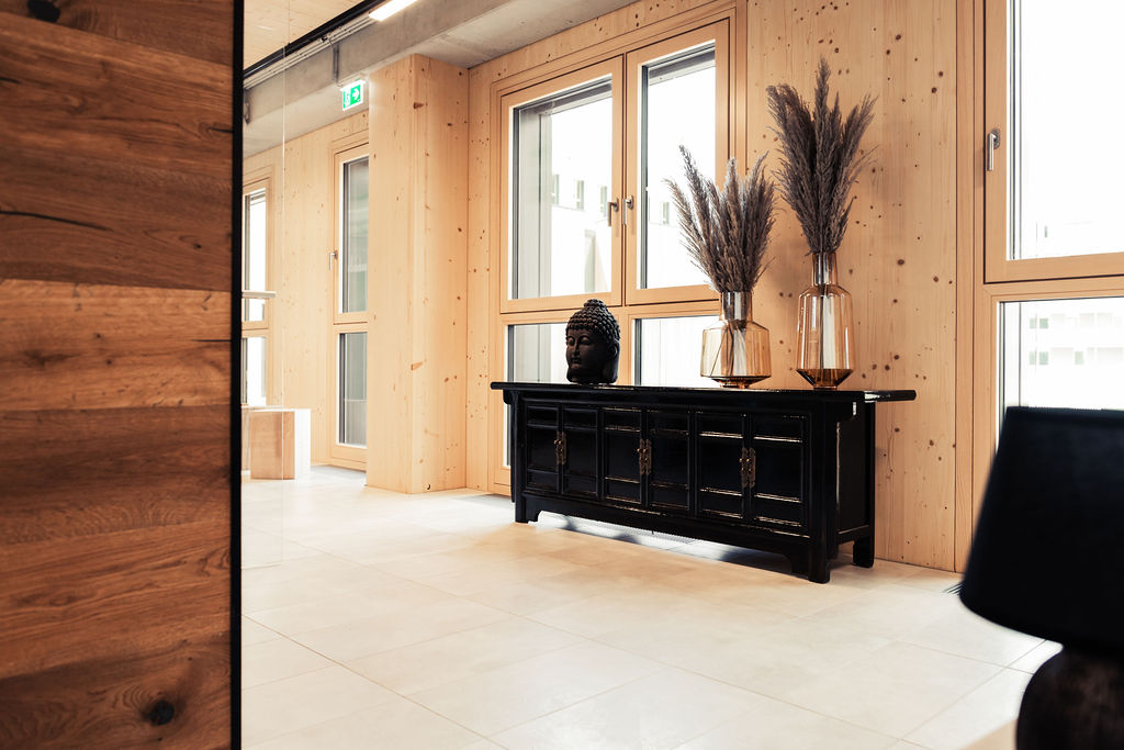Der öffentliche Bau dient allerdings nicht nur der innovativen Nutzung, sondern vor allem auch als Vorzeigeprojekt für den internationalen Holzbau. Aus nachhaltig bewirtschafteten Wäldern, wie beispielsweise aus dem Eigenforst Mayr-Melnhof, kommt das Holz für die in den Geschossdecken eingesetzten X-Lam Concrete (XC®) Deckenelemente. X-Lam Concrete (XC®): X repräsentiert Cross Laminated Timber (verleimtes und gepresstes Brettsperrholz), und C steht für Concrete (Beton).