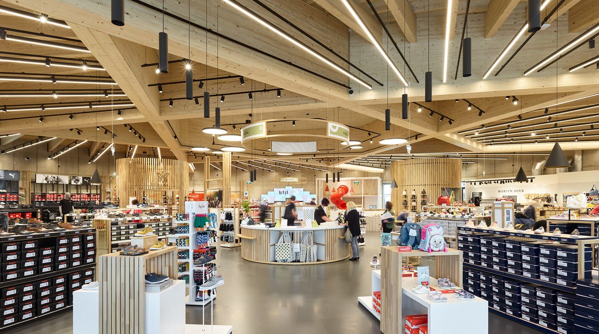 Neben dem Büroring liegt das zylinderförmige Outlet. Seine fließende Raumfolge wird gegliedert durch weitere eingestellte Zylinder unterschiedlicher Größe und Funktion. Dieses Ambiente schafft ein Einkaufserlebnis, das in hohem Maße mit den Marken des Auftraggebers assoziierbar ist und in weiterer Folge durch zusätzliches kreisförmiges Volumen zu einem Fachmarktzentrum ergänzt werden kann.