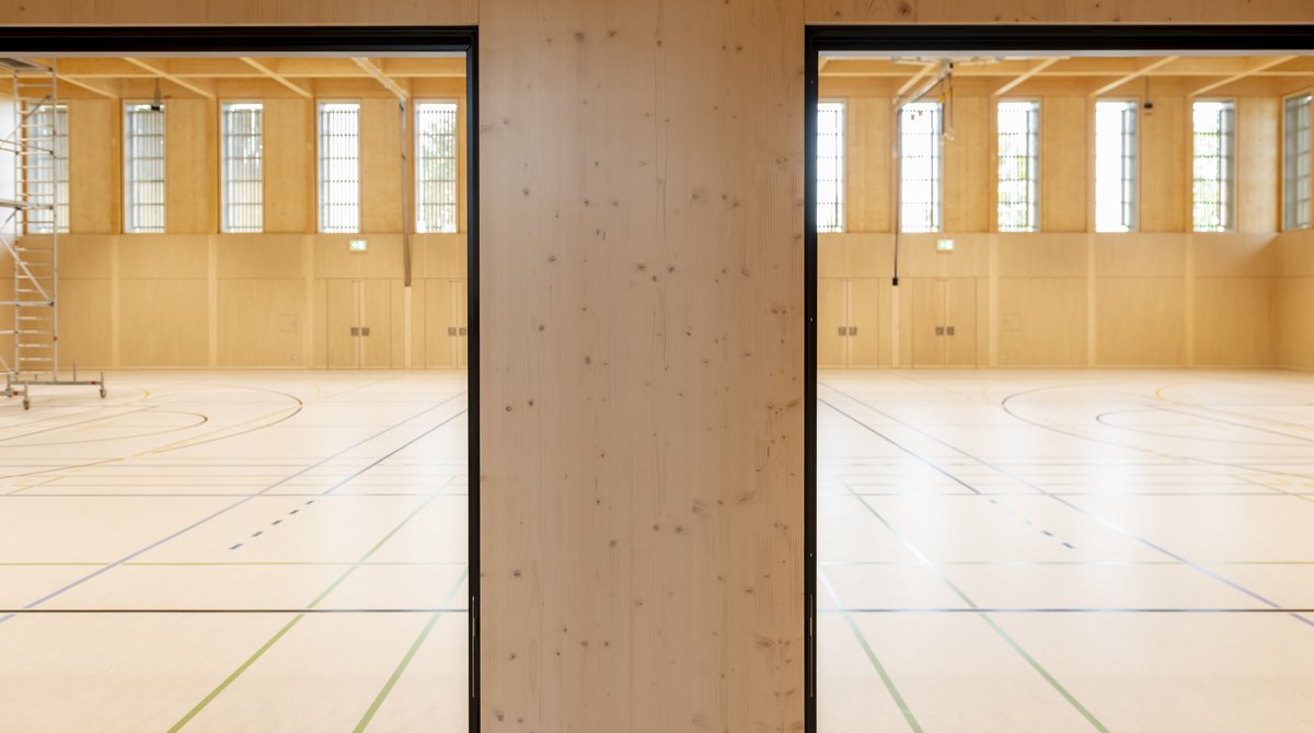 Innen setzen sich die klaren, ruhigen Holzoberflächen fort, die eine logische und übersichtliche Raumorganisation unterstützen. Ein besonderer Blickfang im Foyer ist der in Tannengrün gehaltene Kiosk, der als freistehendes Element zusätzliche Funktionen aufnimmt. Über die offene Treppe gelangen Besucherinnen und Besucher in die Hallenebene, wo die Gestaltung der Fensterfronten für eine optimale Belichtung sorgt. Die doppelflügeligen Türen auf der Südseite öffnen die Halle zum angrenzenden Außensportfeld, das im Sommer als Veranstaltungsfläche dient. Der Bühnenraum, flexibel als Kulissenbühne, Gymnastik- oder Proberaum nutzbar, ergänzt das multifunktionale Konzept. Funktionsräume wie Küche, Sanitärbereiche und Lager sind kompakt entlang der Nebenraumspange organisiert.