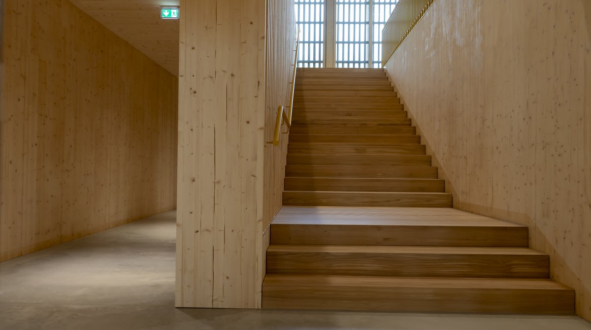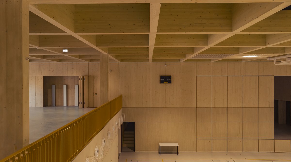 Durch die Hanglage des Grundstücks sind beide Ebenen der Halle barrierefrei zugänglich. Eine spielerisch gestaltete Treppenanlage mit Sitzstufen entlang der Nordfassade führt zum großzügigen Vorplatz und dem Hauptzugang auf der oberen Ebene. Das Foyer empfängt Besucherinnen und Besucher mit einem offenen und fließenden Raumkonzept, das Einblicke in die zweigeschossige Halle mit ihrer imposanten Kassettendecke aus Holz ermöglicht.