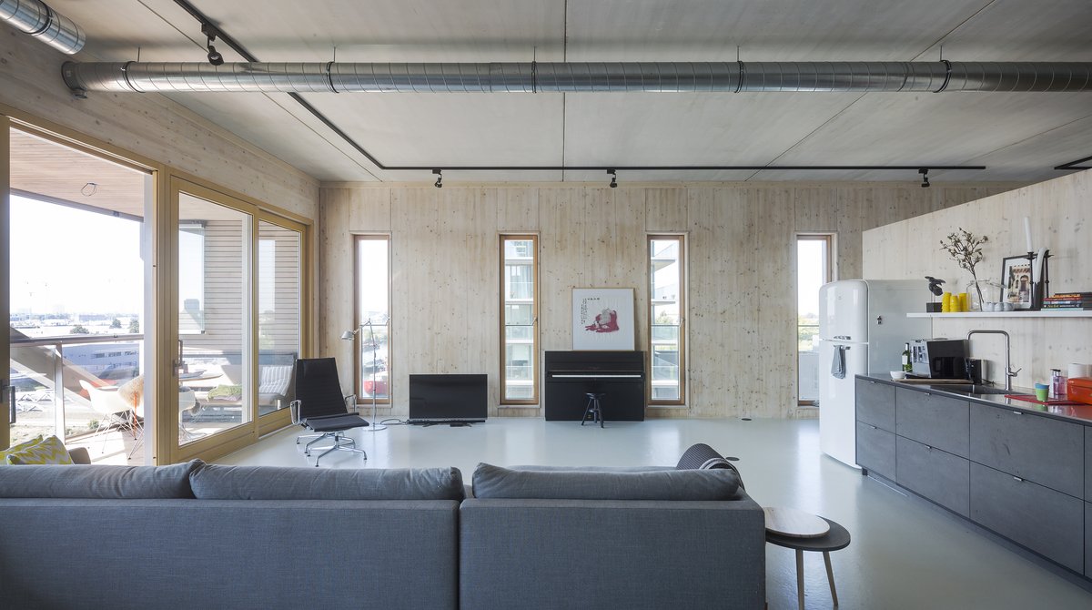 Eine grundlegende Veränderung traf das Industriegebiet im Norden Amsterdams (NL): Seit einigen Jahren findet man hier immer mehr lässige Bars, innovative Restaurants, hippe Stores und Menschen, die dort mittlerweile auch wohnhaft geworden sind. Das Patch 22 verkörpert diese Revolution in einem außergewöhnlichen sechsgeschossigen Bau. Die Wohngeschoße bestehen aus einer Pfosten-Riegelkonstruktion in 50/50er Leimholz – ein Produkt von Mayr-Melnhof Holz, der Sockel und der Versorgungskern jedoch sind aus Betonfertigteilen hergestellt.