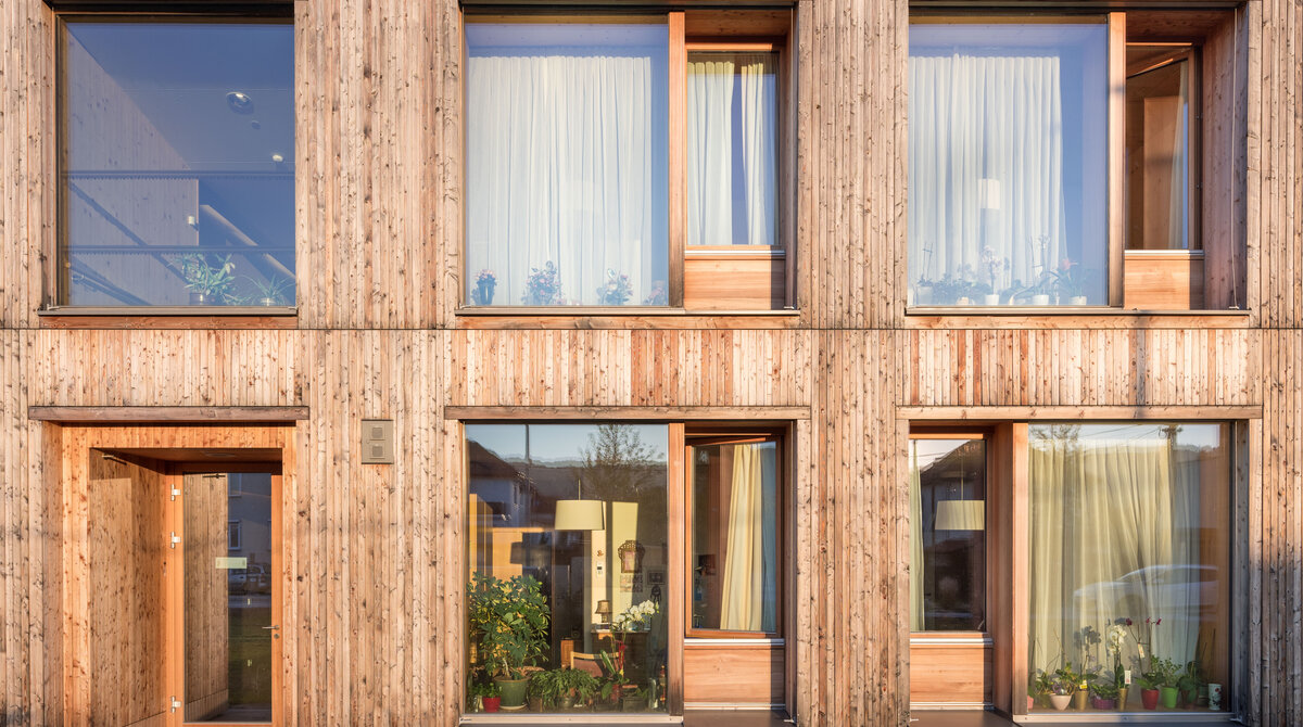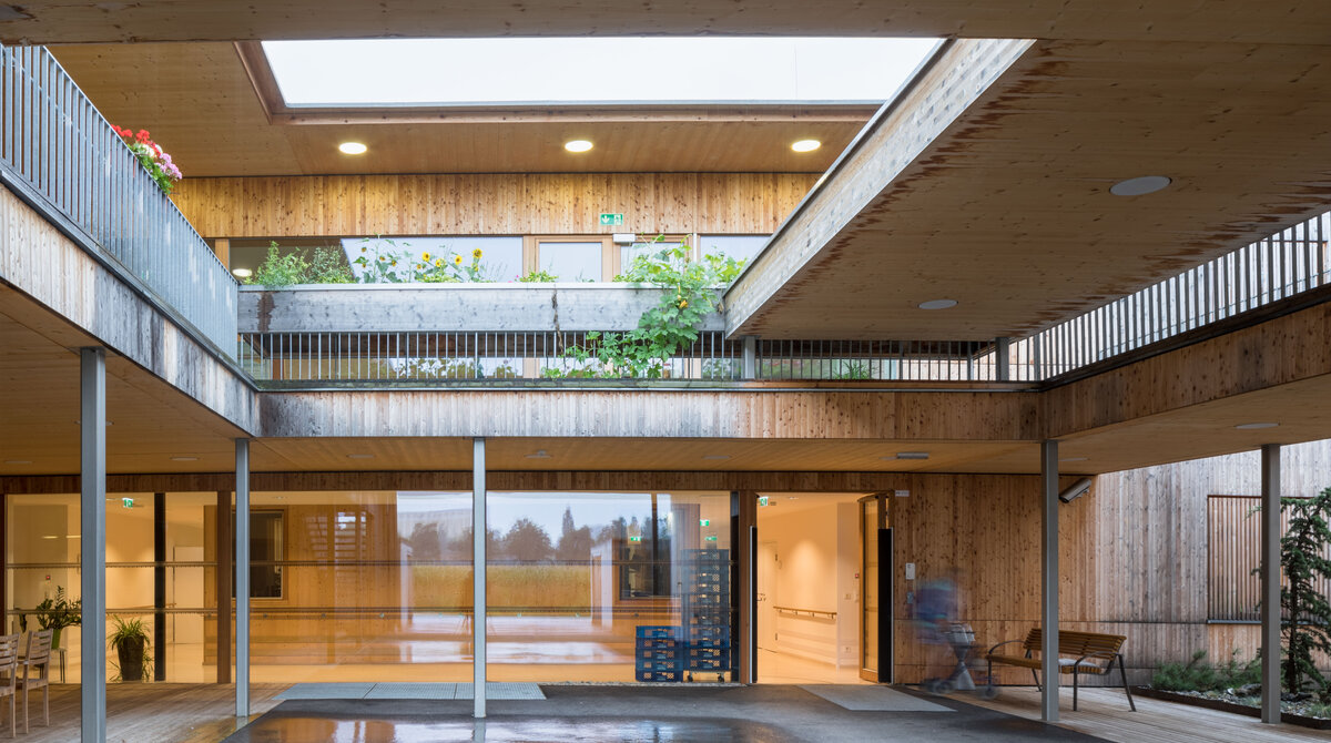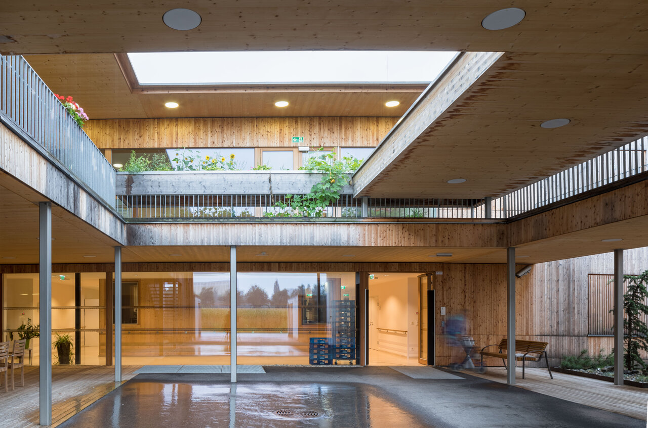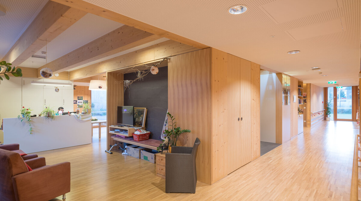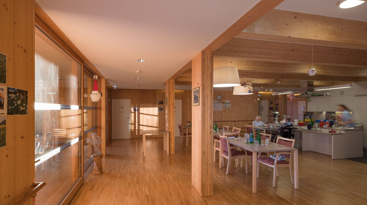 Die einzelnen Hausgemeinschaften mit Zimmern, Gemeinschaftsküche und gemeinsamen Essbereich bieten jeweils 13 Bewohnerinnen und Bewohnern sowie einer Betreuungsperson Platz, was eine überschaubare, familiäre Atmosphäre generiert. Balkone und Loggien in Holzausführung, sichtbare Holzoberflächen in den Zimmern, Gemeinschaftsräumen und Begegnungszonen sowie abwechslungsreiche Wege und Durchblicke innerhalb des Hauses sorgen für eine anregende Umgebung und Wohlfühlatmosphäre. Die Zimmer unterscheiden sich geringfügig je nach Lage und Ausrichtung, alle verfügen jedoch über ein Fenster mit Öffnungsflügel und eines mit niedrigem, beheiztem Sitzparapet. Die Nebenräume zur Pflege sind räumlich zentral platziert, sodass kurze Wege im Arbeitsablauf und eine wirtschaftliche Betriebsführung gesichert sind.