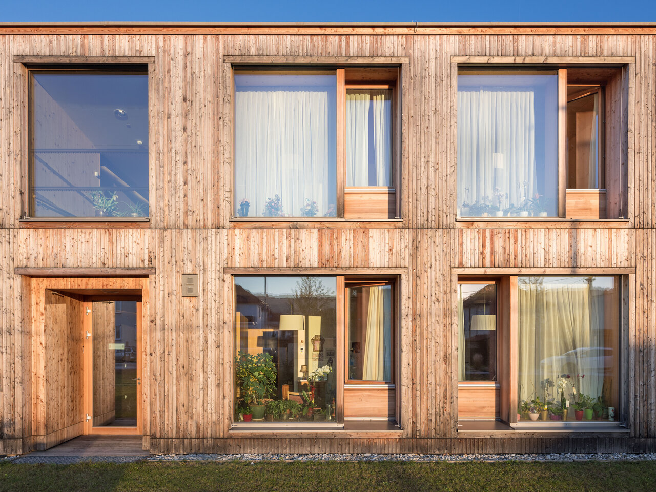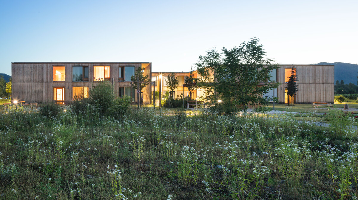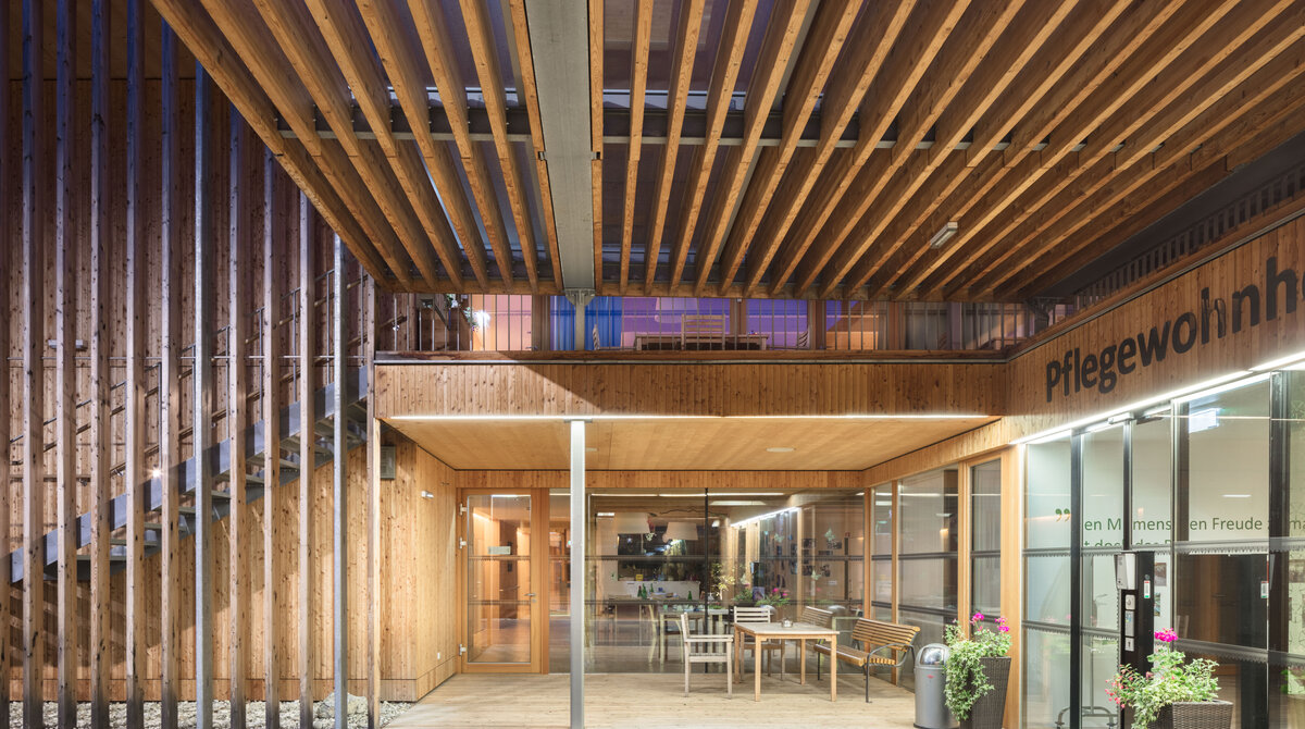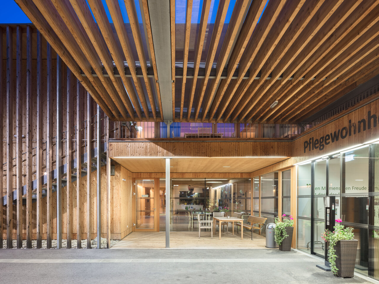 Dank eines detaillierten Brandschutzkonzeptes mit entsprechenden Kompensierungsmaßnahmen konnte das Pflegeheim als vorgefertigter Holzbau in Passivhausbauweise auf einem Kellergeschoss errichtet werden, wobei je nach statischen bzw. bauphysikalischen Anforderungen, eine Holz-Riegel-Konstruktion oder Brettsperrholzwände und Holzrippen- oder Brettsperrholz-Massivdecken zum Einsatz kamen. Die Fassade besteht aus unbehandeltem heimischem Lärchenholz, die Wände im Inneren wurden weitgehend mit Brettsperrholzoberflächen in Sichtqualität ausgeführt. Neben den spezifischen Eigenschaften des Holzes tragen unterschiedliche Ausblicke, lichtdurchflutete Räume, der direkte Bezug zu Freiräumen und zum Grün, vielfältige Sitz- und Aufenthaltsmöglichkeiten im Inneren des Hauses und in den Gärten, sowie eine abwechslungsreiche Abfolge von besonnten und beschatteten Außenbereichen zum freundlichen Ambiente in dieser letzten Bleibe für Menschen bei.