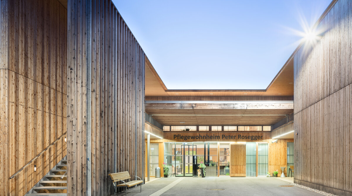 Das zweigeschossige Pflegeheim Peter Rosegger in Graz (AT) befindet sich am Areal der ehemaligen Hummelkaserne in einem städtebaulich heterogenen Umfeld. Das kompakte, zweigeschossige Gebäude mit fast quadratischem Grundriss und leicht asymmetrischen Einschnitten bietet das räumliche Konzept für acht Hausgemeinschaften – vier pro Geschoss, die um einen zentralen, innenliegenden „Dorfplatz" gruppiert sind. Dieser wurde durch das Gebäude durchgesteckt, darüber befindet sich ein Dachgarten zur gemeinschaftlichen Nutzung. Im rechten Winkel zu dieser öffentlichen Achse sind je zwei weitere in das Gebäude eingeschnittene Gärten angesiedelt, die den Bewohnerinnen und Bewohnern des Hauses vorbehalten sind. Ergänzt wird das Angebot an Freiflächen durch vier den Hausgemeinschaften zugeordnete Atrien im Obergeschoss sowie die direkte Anbindung an den von der Stadt Graz geplanten öffentlichen Park an der Ostseite des Areals.