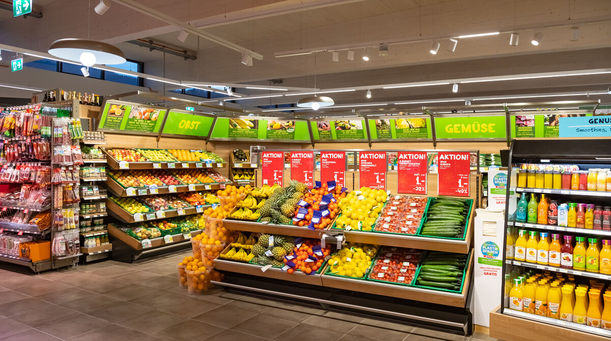 Die Gegend rund um Frohnleiten (AT) zählt zu den waldreichsten Gebieten der Steiermark. Die SPAR-Filiale neben dem Bahnhof im Ort referenziert auf diese spezifische topografische Situation: Für den rund 700 Quadratmeter großen Markt, der 2019 in nachhaltiger und ressourcenschonender Holzbauweise errichtet wurde, kamen über 450 Kubikmeter Brettsperrholz, Brettschichtholz und Massivholz zum Einsatz. Das Holz, das verarbeitet wurde, stammt aus der Region aus ausschließlich PEFC-zertifizierten Wäldern. Innerhalb von nur 30 Minuten wächst das insgesamt verbaute Holz-Volumen von 450 m3 in den steirischen Wäldern nach.