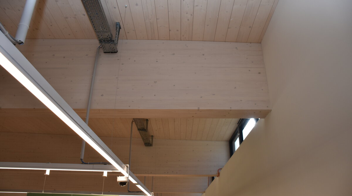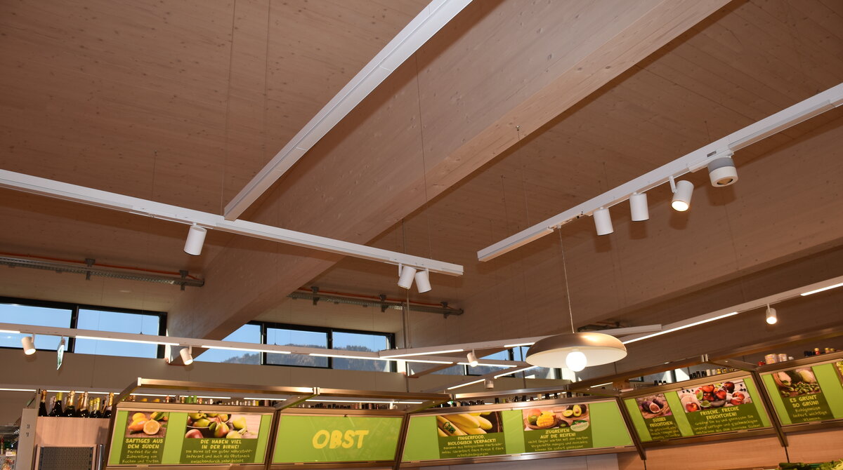 Auch im Bereich des Handels spielen ökologische Kriterien eine immer größere Rolle. Ausgeführt in moderner nachhaltiger Holzbauweise ist der regionale Nahversorger des österreichischen Lebensmittelkonzerns SPAR in Frohnleiten (AT). Der natürliche Rohstoff dafür stammt aus heimischen Wäldern der unmittelbaren Umgebung. Eingesetzt wurden beim Bau Brettsperrholz MM crosslam für die Wände und Decken und Brettschichtholz Sonderbauteile MM masterline für das primäre Hallentragwerk.
