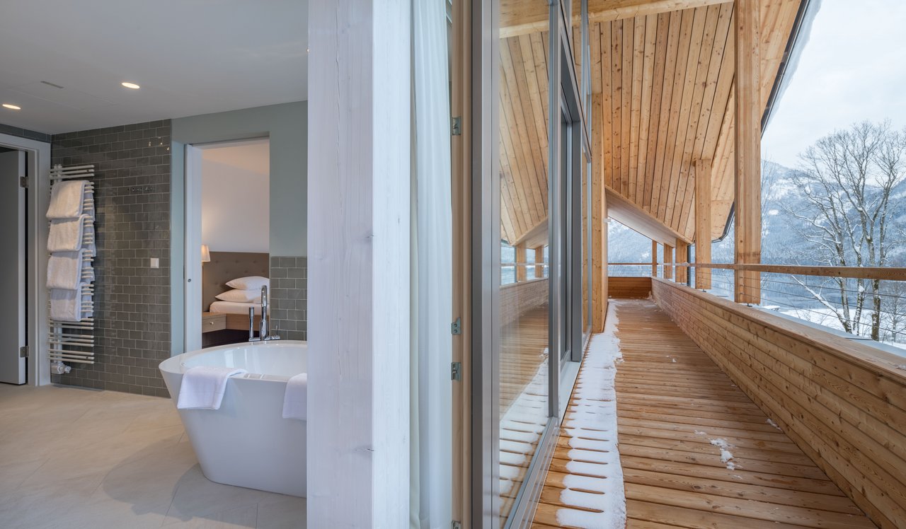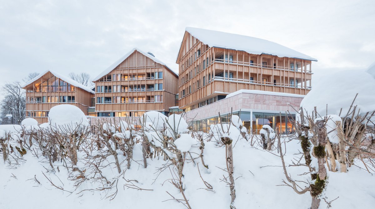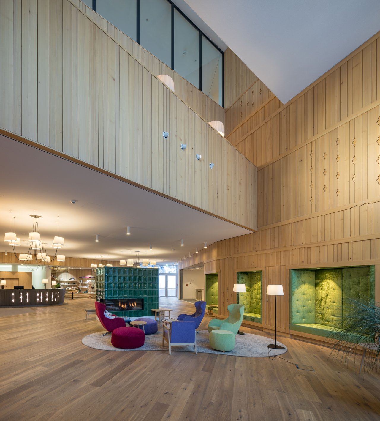 Die Zimmergeschosse und die vorgelagerten und eingezogenen Loggien sind in innovativer und ökologischer Massivholzbauweise gefertigt, das wertvolle Rohmaterial Holz für die PEFC-zertifizierten Holzelemente von Mayr-Melnhof Holz stammt direkt aus der Region.