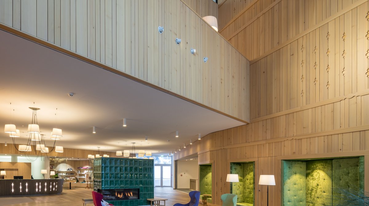 Die architektonische Gestaltung des Viva Mayr-Kurhotels fügt sich durch die ökologische Holzbauweise perfekt in die traditionelle Bebauung von Altaussee (AT) ein. Der mehrgeschossige Bau mit Steinsockeln und ansprechenden Holzfassaden orientiert sich am typischen Baustil der Umgebung. Mayr-Melnhof Holz lieferte das Brettsperrholz MM crosslam für die Zimmergeschosse und die vorgelagerten und eingezogenen Loggien.
