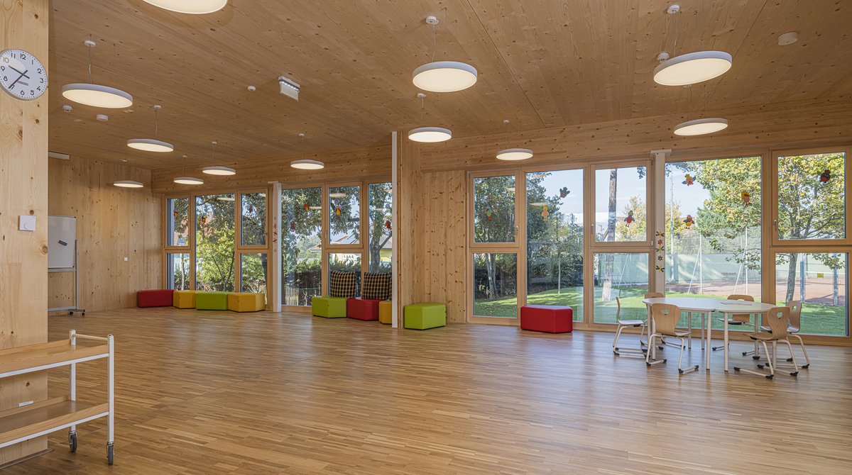 Der hohe Vorfertigungsgrad der XC®-Elemente und der Brettsperrholzwände machte es dann auch möglich, dass die Bauzeit auf knapp 11 Monate verkürzt werden konnte. „Bei jedem Schulbau zählen neben dem Anspruch, ein Gebäude zu errichten, das den modernen pädagogischen Erkenntnissen genügt, auch der ökologische Aspekt und natürlich das Thema Bauphysik zu den Herausforderungen. Mit unseren Massivholz- und Hybridlösungen konnten wir Nachhaltigkeit, Spannweite, Schallschutz, Brandschutz und Bauzeit – damit natürlich auch Kosten – unter einen Hut bringen.“, so Sebastian Knoflach, Geschäftsführer der MMK und Produktmanager für Brettsperrholz bei Mayr-Melnhof Holz.