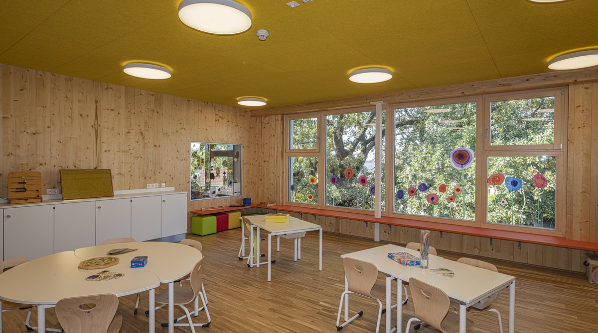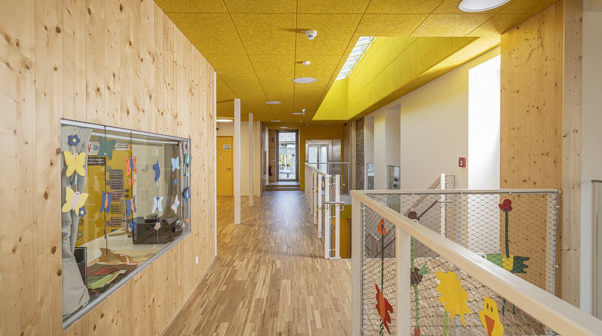 1908 wurde in Moosbrunn bereits eine Volksschule eröffnet. Mehrmals im Laufe der Jahre renoviert, standen nun eine umfassende Sanierung, die Modernisierung und Erweiterung auf dem Plan. Die Gemeinde setzte auf eine zukunftsfitte, klimaaktive Bauweise. Hier wurde das richtige Baumaterial an den richtigen Stellen eingesetzt: Beton-Massiv Maba FTI-Fertigelemente im Keller und für die Treppen und für die tragenden Wände Brettsperrholzelemente MM crosslam. Zudem wurden Holz-Beton-Verbundelemente XC®living von MMK, einem Joint Venture der Kirchdorfer Gruppe und Mayr-Melnhof Holz, verbaut. Diese innovativen Verbundelemente aus Brettsperrholz und Beton sind besonders für Zwischendecken und Dachkonstruktionen geeignet. Sie finden vor allem dort Anwendung, wo die Herausforderung an Schallschutz und Spannweite groß sind und eine sichtbare, haptisch angenehme und Atmosphäre verbreitende Holzoberfläche gewünscht wird, wie bei einem Schul- oder Kindergartenbau, bei Pflegeheimen, Bürogebäuden und modernen Wohnräumen.