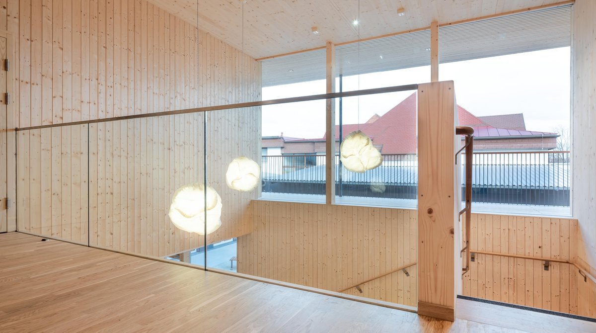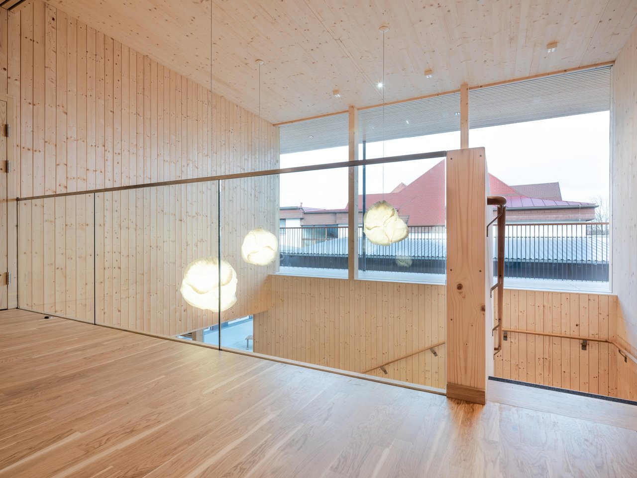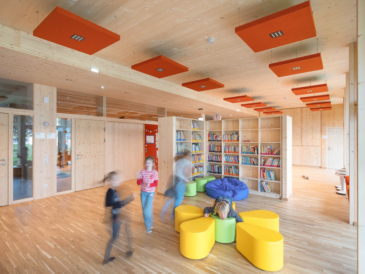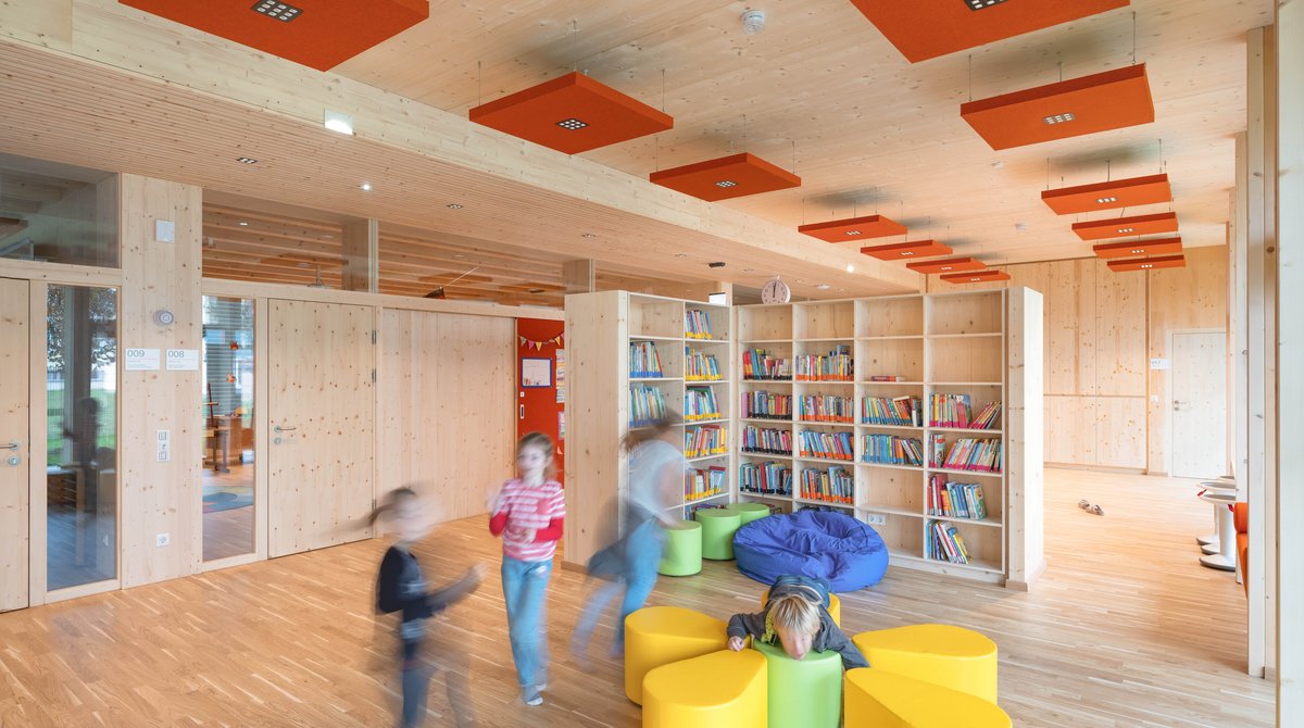 Bei der Materialwahl setzte man auf ökologische und nachwachsende Rohstoffe, diese sorgen in den Innenräumen für eine angenehme Atmosphäre und eine fördernde Lernumgebung. Holzoberflächen und sorgfältig ausgewählte Farben geben den Räumen eine klare Struktur, ohne jedoch abzulenken.