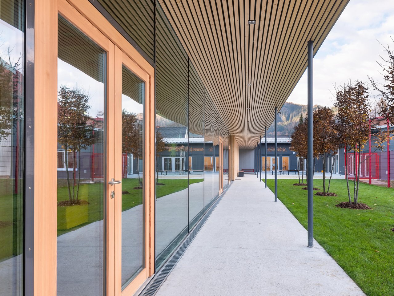 Der Baukörper ist als Holzbau konzipiert, was ein hohes Maß an Vorfertigung gewährleistet und somit eine kurze Bauzeit ermöglichte. Die Decken wurden als Holzrippendecke mit aufgeleimten BSH-Rippen gefertigt, wodurch auch große Spannweiten in den Klassen überbrückt werden konnten. In den Zwischenräumen der Rippendecke wurden Akustikelemente eingehängt. Im gesamten Gebäude wurden Lärchenholzfenster eingebaut. Einerseits ist das Lärchenholz ein regionales, nachhaltiges Produkt, andererseits entsteht durch das Holz eine angenehme Wohlfühlatmosphäre.