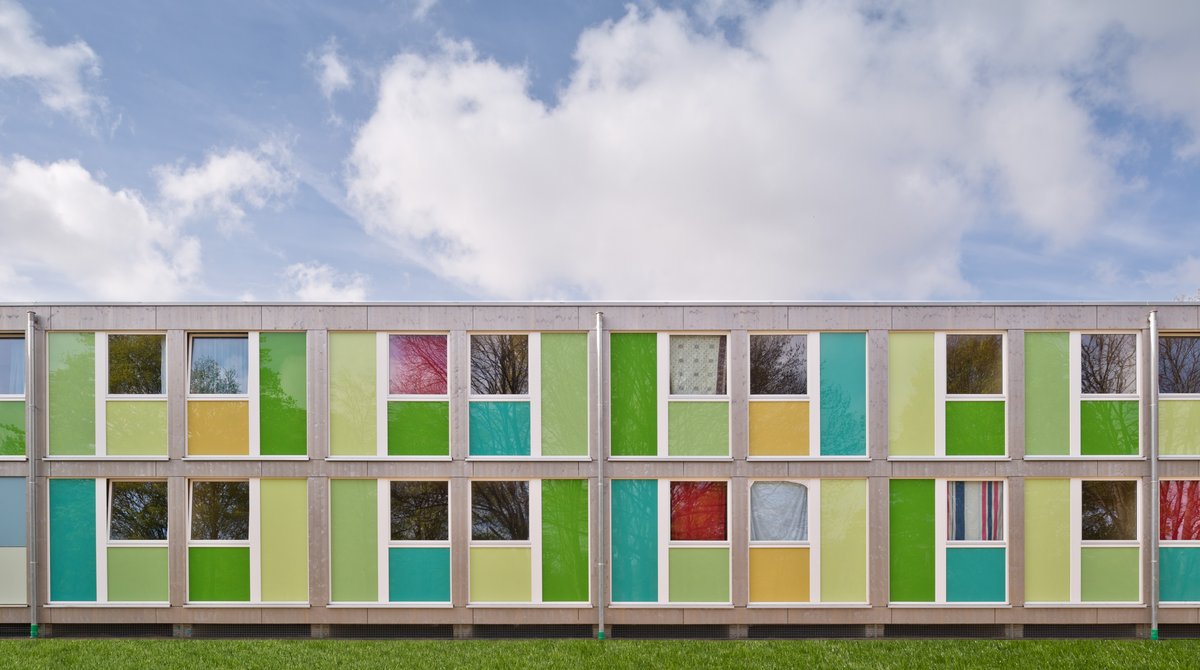 Die zweigeschossige Wohnanlage mit 96 Zimmern für Flüchtlinge strahlt durch ihre Farbigkeit Optimismus und Zuversicht aus. Die serielle Fertigung ist an der Fassade ablesbar, ohne „billig“ zu wirken. Die u-förmige Anordnung der drei länglichen, doppelstöckigen Baukörper und dem als Gegenüber leicht aus der Mitte platzierten Gemeinschafts- und Verwaltungsbaus, spannen einen offenen Zwischenraum auf. Dieser lässt Begegnungen zu ohne aufdringlich zu sein, und wird durch die laubengangartige Erschließung im oberen Stockwerk unterstützt. Die Wohneinheiten sind logisch und flexibel strukturiert. Die notwendige Einfachheit von Modulbauten ist vorhanden, jedoch subtil, direkt und mit einer warmen Ausstrahlung umgesetzt.